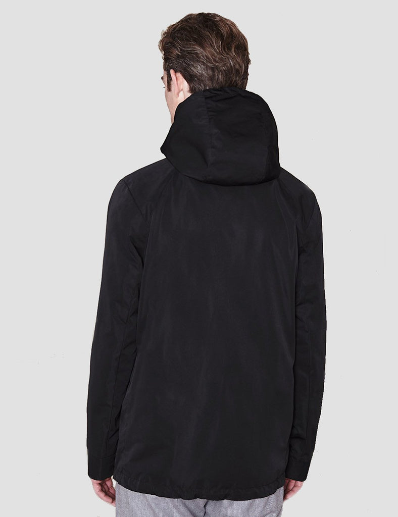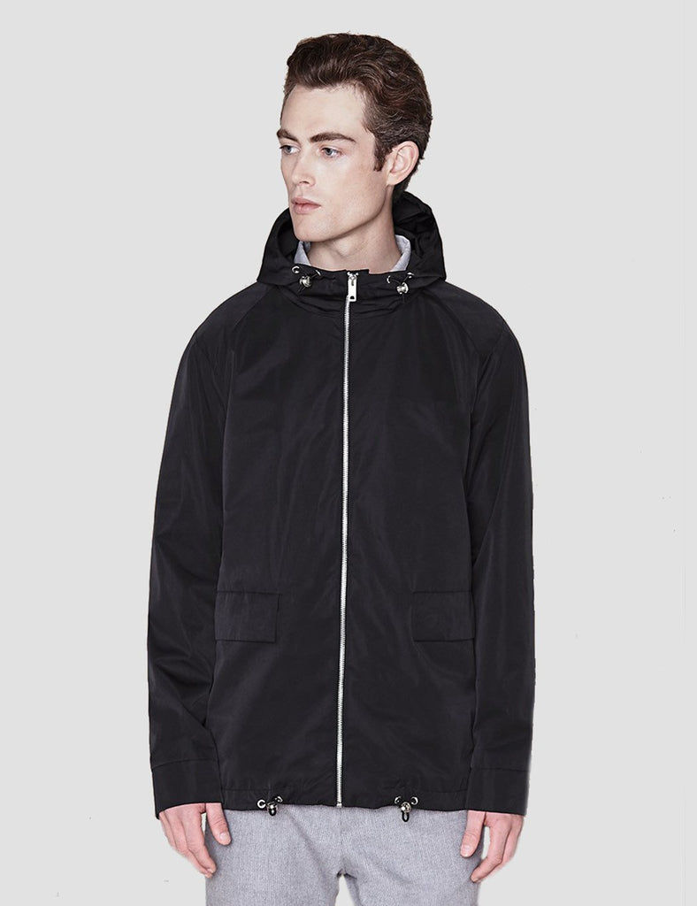 The Tobias is a medium length water-resistant jacket. It features a full zip-up front, drawstring hood, two pockets on the front with flap and magnetic button, interior pocket, taped seams and mesh lining.