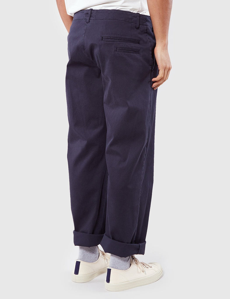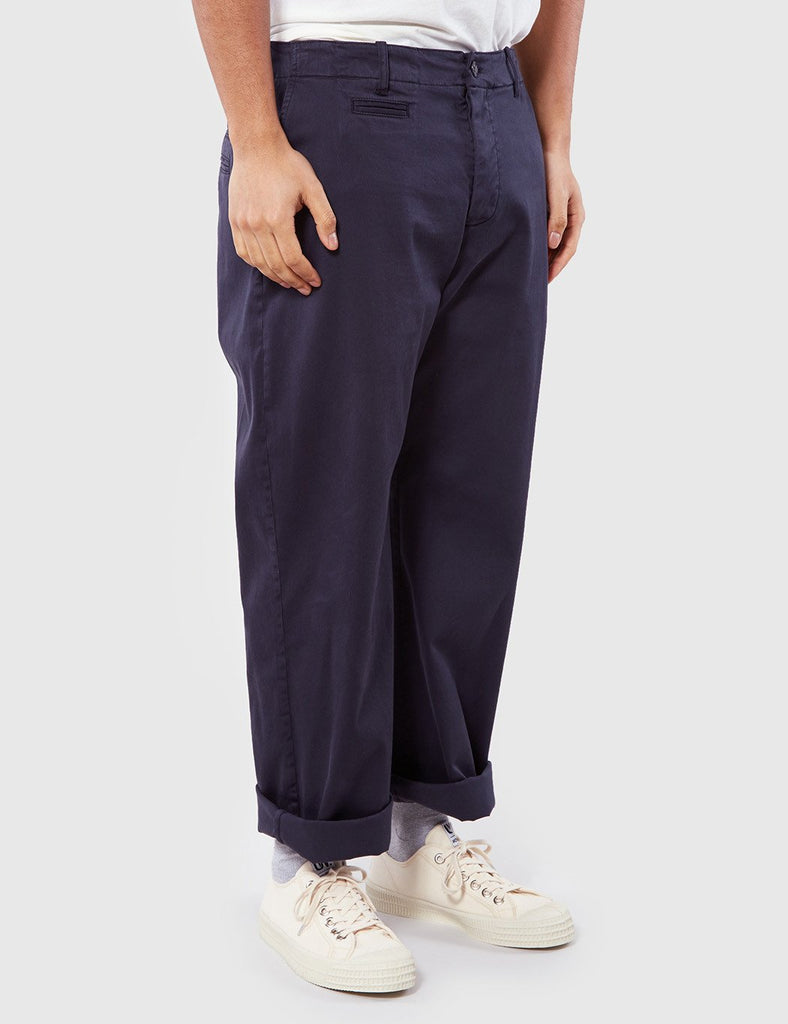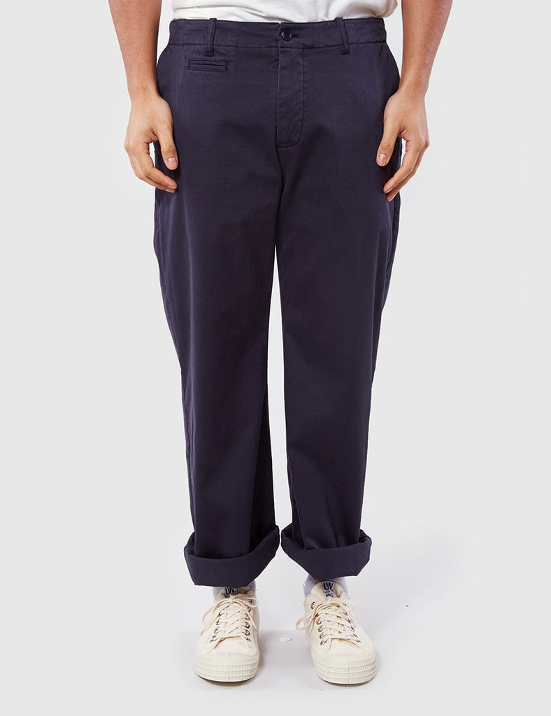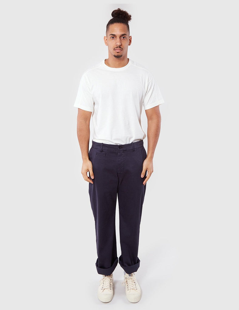 The YMC Thin White Duke cotton twill trousers in Navy blue from the YMC trousers Spring/Summer 2017 collection. Product Details: Material: 98% Cotton, 2% Elastane, garment dyedFit: Relaxed Product MPN: P4HAP